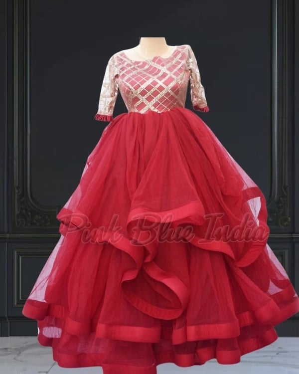 She is going to looking stunningly gorgeous dressed in the wine coloured layered gown made with net fabric. An awesome party wear gown designer to make birthdays, fashion shows and weddings prettier for her. Buy online this lovely gown for girls which comes with an amazing flare and a beautiful bodice with crisscross pattern. Go with this unique birthday gown for teenage girl which comes in variable sizes starting from 1 to 15 years. And don’t miss on a matching hair accessory that comes with this glittery gown.