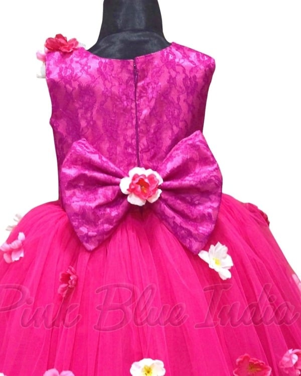 Shop for this lovely pink gown dress for girls with sleeveless bodice and beautiful flare adorned with flowers. This pink color gown party wear outfit comes with a big bow and makes a perfect dress to wear for birthday parties. Dress her up in this lovely party wear gown which includes a matching hair accessory. It makes a lovely outfit for teenage and baby girls up to 12 years of age.