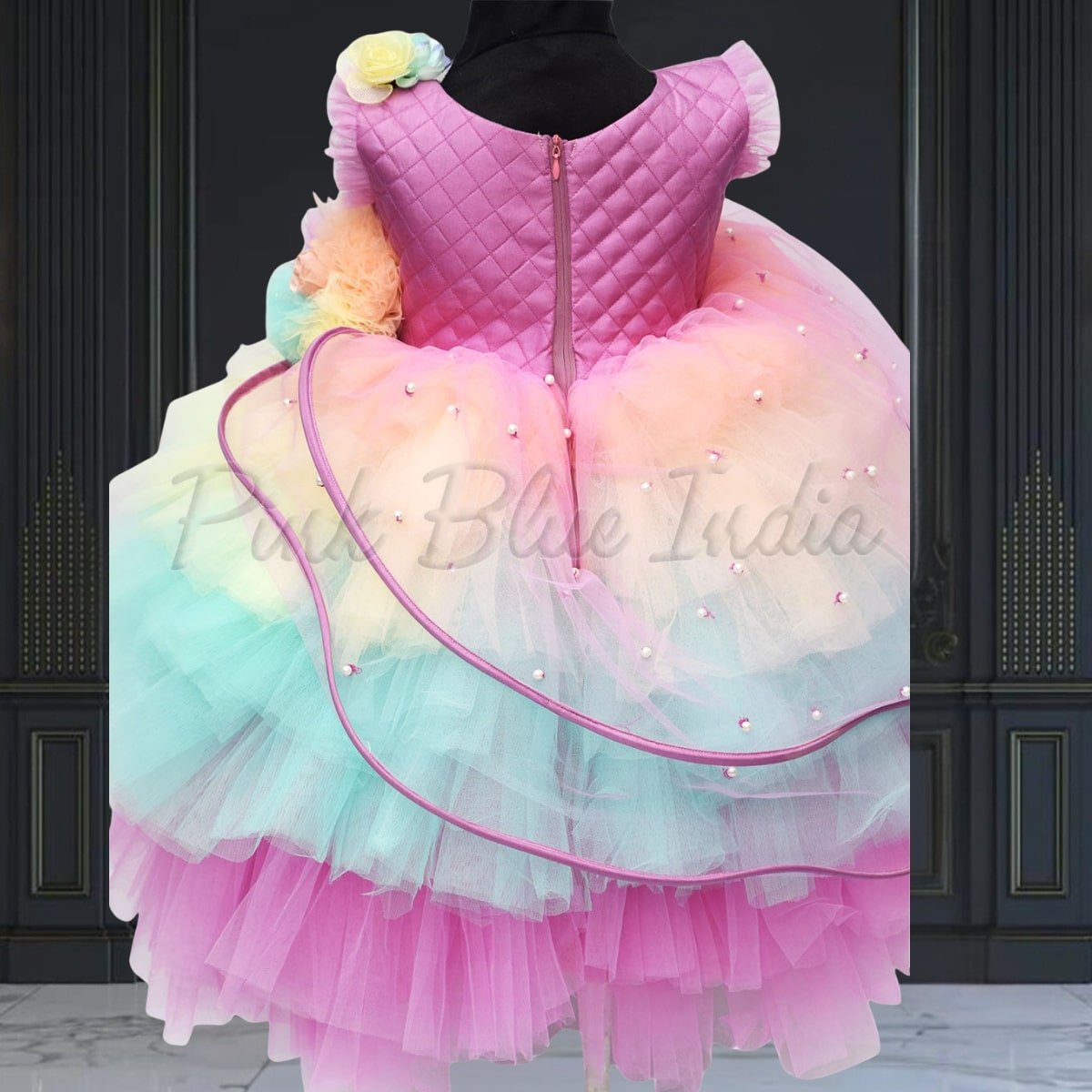 This is one of the most creatively designer unicorn inspired party dress. Made with love, this is a wonderful unicorn fantasy gown to make birthday parties and weddings all the more gorgeous. Designed for girls for 6 months to 12 years, this unicorn gown comes with a sleeveless cushioned bodice embellished with flowers. The ruffled layered flare with an additional netted flare with beads adds more volume to this breath-takingly beautiful party gown which is a must to shop online for your princess.