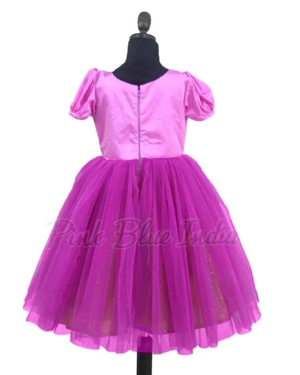 Designed especially for the unicorn themed birthday parties, this purple colored unicorn dress is designed with net fabric. The bodice of this dress is beautifully embellished and the flare adds a sparkling touch to the dress. Designed for baby girls of age 6 months to 12 years, this rainbow unicorn themed dress includes a matching hair accessory.