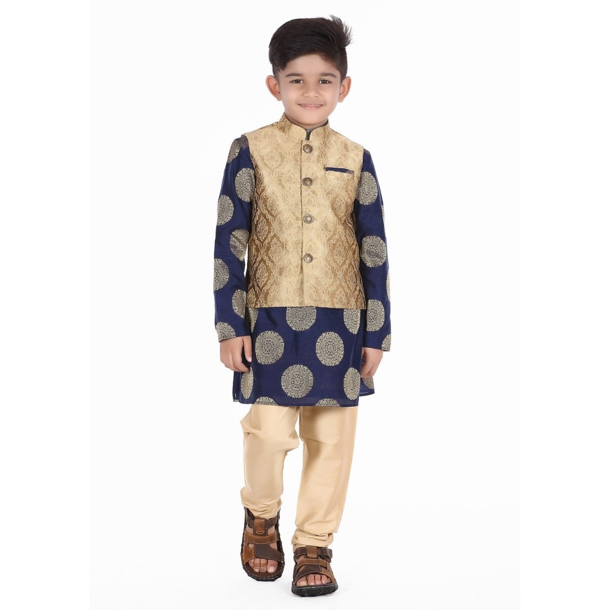 Handsome ethnic wear for boys in India. Indian traditional navy blue kurta with zari embroidery is matched comfortable churidar pants and an awesome silk long jacket making it an exquisite festive dress to shop online for boys. A perfect combination of clothing to buy for kids falling in age group of -2 year, 2-3 years, 3-4 years, 4-5 years,5-6 years and 6-7 years to dress them smartly for Indian festive occasions, parties and weddings. Crafted using high quality silk fabric, this dress is soft on baby skin.