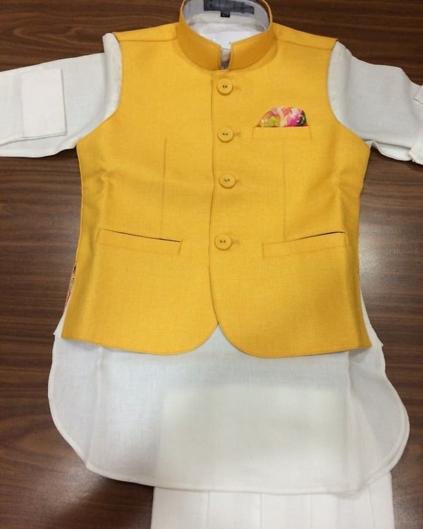 The traditional kurta pyjama in white color is the most elegant party wear ethnic clothing for toddler boys. Dress your little infant in this smart Indian attire which comes with a gorgeous yellow colored waist coat. Shop online for this kids ethnic wear for your children. Online shopping from any part of India makes it a wonderful choice.