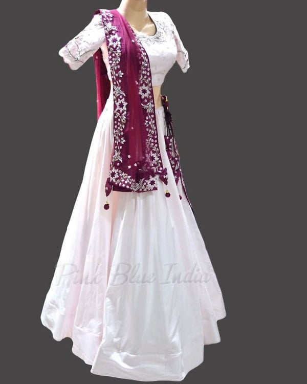 This designer pink lehenga chunni set made using silk makes a gorgeous traditional dress for women. Having a wide range of sizes to choose from XS to XXL, the choli and dupatta has intricate anchor thread embroidery with jardozi work. Dress elegantly for weddings, festivals, sangeet and reception in this fabulous ethic lehenga set for women in India.
