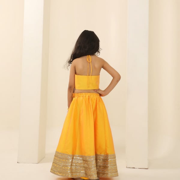 Stylish yellow halter neck lehenga for girls, ideal for weddings and family celebrations. Lightweight, festive and perfect for Indian functions.